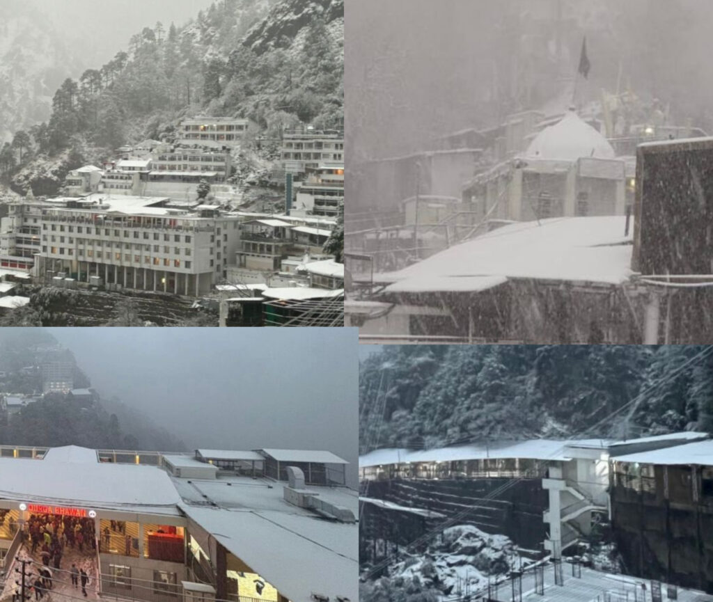 Devotees were blessed to witness breathtaking weather as fresh snow gently adorned the holy surroundings of Maa Vaishno Devi Bhawan and Bhairon Temple, filling the atmosphere with serenity, devotion, and divine bliss.